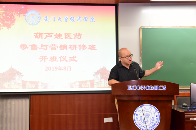在开班仪式上,廖景峰主任首先代表厦门大学经济学院热烈欢迎PA官方网站医药零售与营销研修班的学员到厦大学习,并就厦门大学及经济学院的相关情况进行了介绍。他说,PA官方网站学员走进厦大就是厦大的校友,希望未来的日子能够关心、支持母校的发展,多提宝贵意见,同时他也祝大家在厦大学习期间学有所成、学有所获。